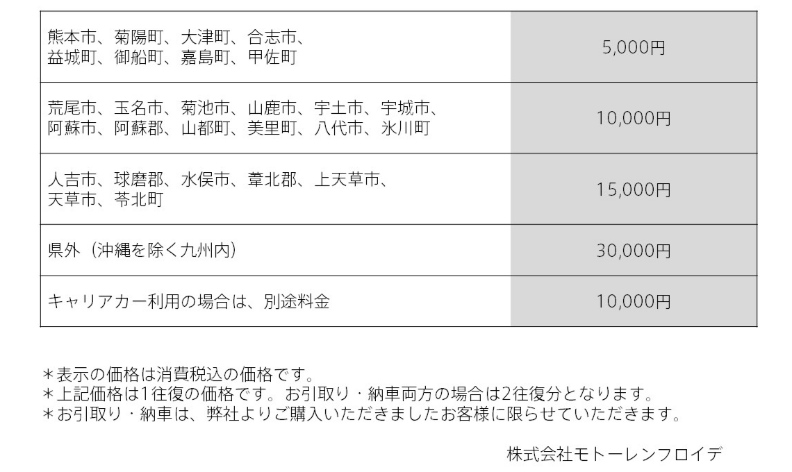 2026年1月1日以降の引取り・納車サービスの対象地域および代金については以下をご確認下さい。